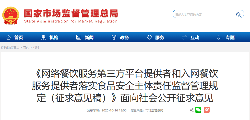为进一步加强收集餐饮办事食物平安监管,国度市场监视办理总局10月16日发布了《收集餐饮办事第三方平台供给者和入网餐饮办事供给者落实食物平安从体义务监视办理(收罗看法稿)》,向社会公开收罗看法,外卖平台及商家送来大考。